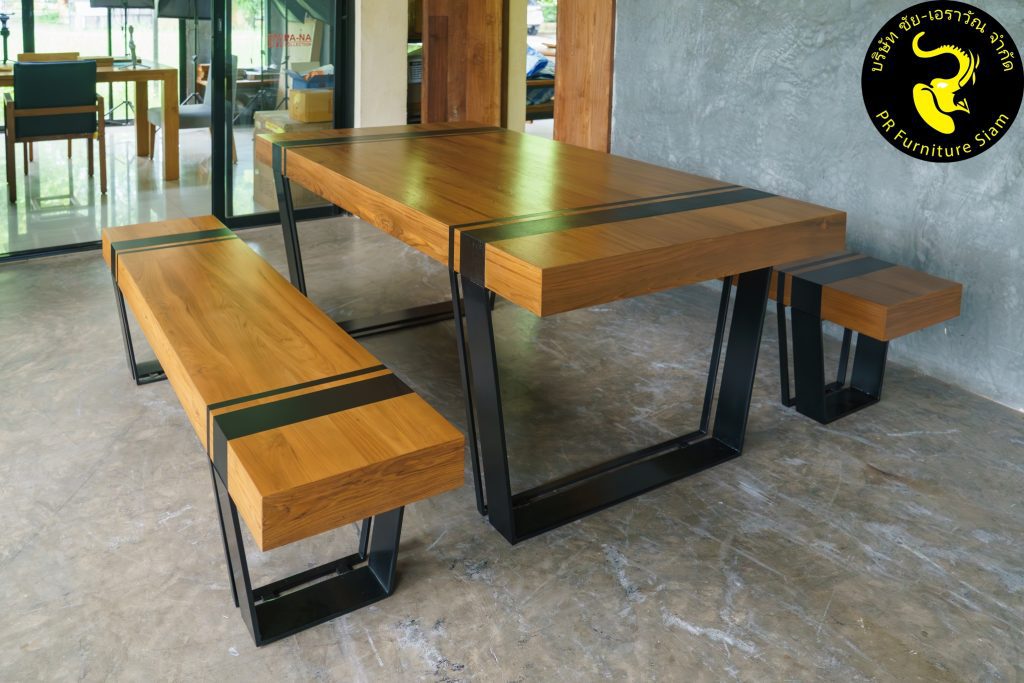 ชุดโต๊ะกินข้าวไม้สัก พร้อมม้านั่งยาวไม้สัก ขาเหล็ก แบบโมเดิร์น คาดไม้สีดำ ประกอบด้วย